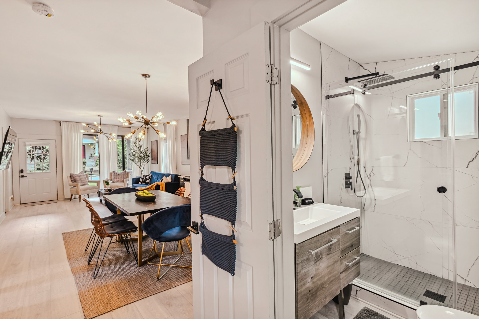 Step into this elegantly simple Southern home, where modern comforts meet sophisticated design. The house features high-end decor with tasteful splashes of color in the fixtures and pillows, creating a warm and inviting atmosphere. You'll love the luxurious marble tiles in the shower and kitchen, adding a touch of opulence to your stay.